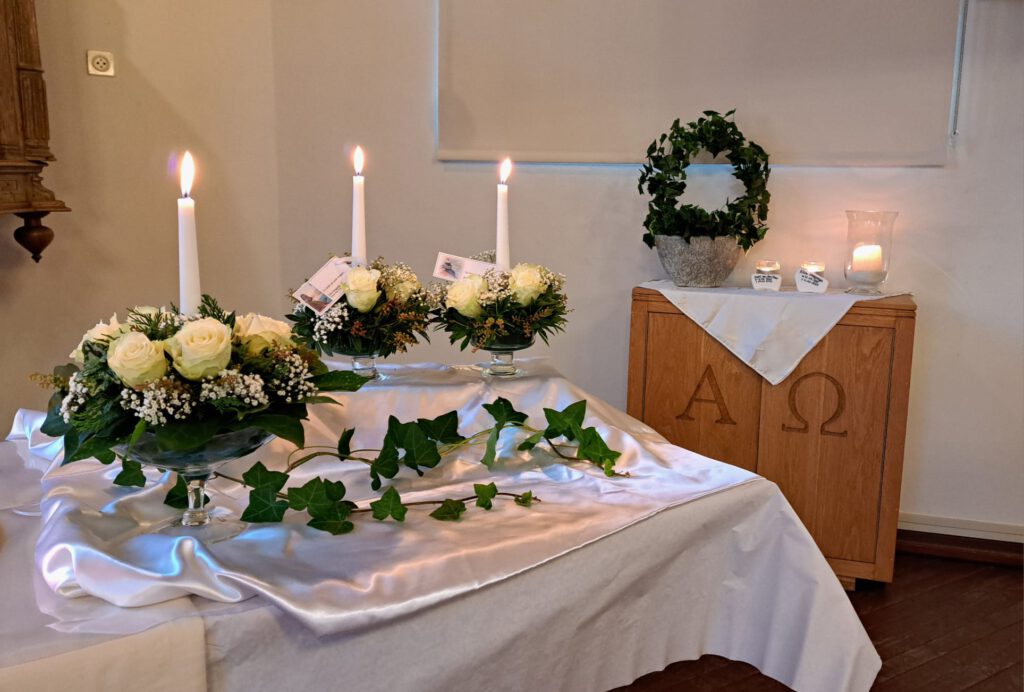 Tjerie en Tryntsje hebben voor een smaakvol Pinksterbloemstuk gezorgd, dat bol staat van de symboliek. U ziet bladeren van de vingerplant: die verbeelden de hand van God, waarin wij geborgen zijn. De drie rode rozen staan voor de Drie-eenheid: Vader, Zoon en Heilige Geest. De grassen staan voor de wind, de inspiratie van Pinksteren. Het gipskruid met de oranje bloemetjes voor het vuur, het enthousiasme van Pinksteren. De witte roos in het midden verwijst naar Jelle Bouke. Ook hij is geborgen in de hand van God. Wit is de kleur van de reinheid van een nieuw leven, in het licht van God.